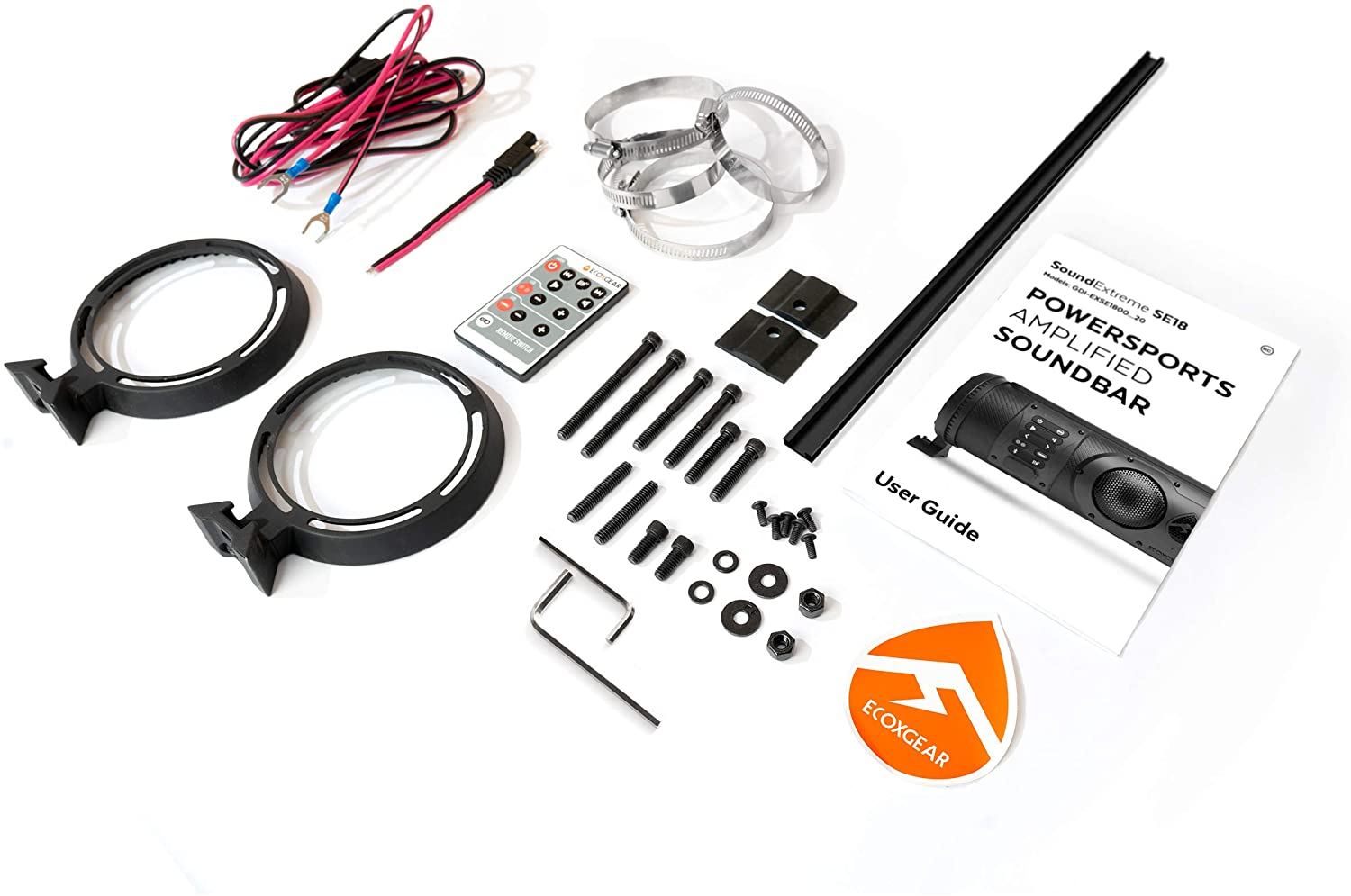 100% Waterproof (IP66) – shock resistant, sand proof and dust proof!Multi-Color LED Backlit Speakers – green, red, white, blue; music sync, solid, fading or offRear Facing 160 Lumens LED Light Bar – white (high, medium, low), red, yellow or off300 Watts – peak output with optimized bass performance provides deep bass and clear vocalsMarine Grade 5 Speaker System – 1 tweeter, 2 midrange, and 2 woofersBluetooth 5.0 – streams your music from your phone up to 100 feet away; or connect to the integrated wired AUX-IN jackIntegrated Controls – volume, play/pause, forward/back, backlit speaker and light bar modeFast Charge – any device via the 2.1A USB port12V Power Outlet – to connect accessory light bars or speakersECOCAST – Connect up to 50 ECOXGEAR speakers with the ECOCAST feature (not compatible with ECOCONNECT generation speakers)ECOTALK – for direct connect to Siri or OK Google and built-in speakerphoneEasy to Install – multiple mounting options with the included 8-foot wiring harness, mounting brackets and related hardwareWhat is in the Box – SoundExtreme SE18, user guide, 12V DC power supply cable, auxiliary power out mating connector, 2x mounting brackets and related hardware, and long range RF remote control; 1 year warranty on parts and labor